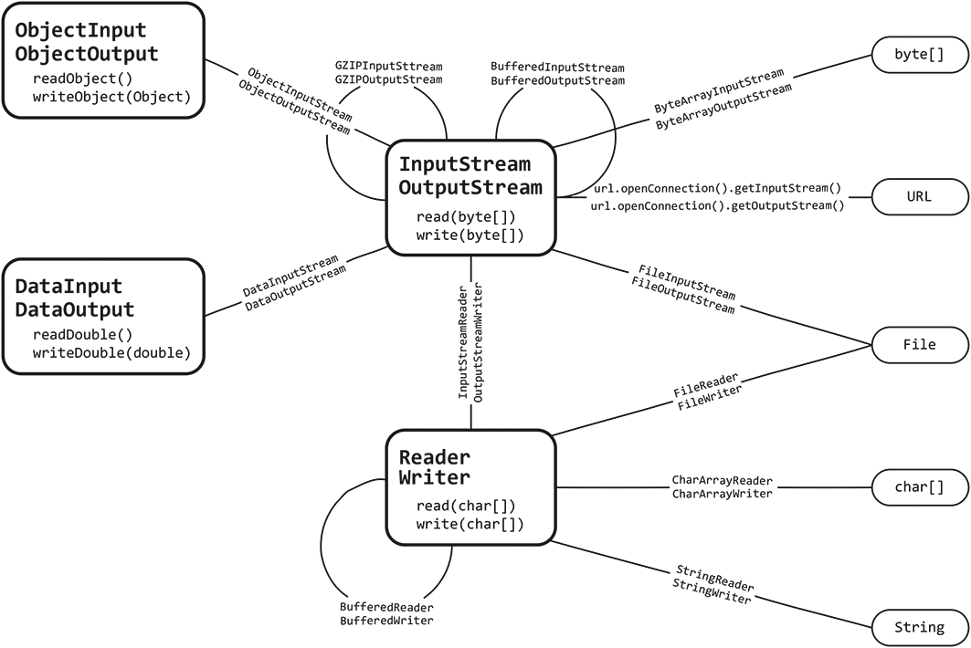 | Java IO Из-за того, что скорость доступа к жесткому диску несоизмеримо меньше, чем к оперативной памяти, Java IO (input-output) ориентирована на потоки (streams). Говорить о Java input и output есть две причины. Первая – что мы говорим о передаче данных в виде потока (массив – это ограниченный кусок), а поток может прекратиться по требованию. А вторая, потому что мы часто переходим барьер JVM. Всего мы дважды пробиваем барьер JVM – на вводе и на выводе. Например, сначала, чтобы байты от веб-камеры попали в heap, в JVM на видео будет применен кодек, а потом, чтобы отдать их операционной системе, которая отдаст байты винчестеру, который запишет сырые байты. Дизайн пакета java.io исходил из следующего: нужен некий метод copy(? src, ? dst), который получает какой-то источник и какой-то пункт назначения непонятных типов, и который мог бы скопировать что-угодно. Например, из файловой системы на аудио, проиграть какой-то mp3-файл, с веб-камеры делать трансляцию в интернет или сохранять байтовый массив. И чтобы это все делал один метод copy. Для этого нужно было придумать какие-то типы. Потоки ввода-вывода можно проиллюстрировать с помощью диаграммы: Решили, что будет два универсальных типа: InputStream и OutputStream. Это оба абстрактные классы. InputStream – это абстрактный класс, который принимает байты, а OutputStream – абстрактный класс, который отдает байты. Итого, если написать метод copy(InputStream is, OutputStream os), то в теле метода copy можно оперировать этими двумя абстракциями. Для работы с файловой системой есть классы FileInputStream и FileOutputStream. Для байтового массива – ByteArrayInputStream и ByteArrayOutputStream, которые являются классами-адаптерами. InputStream и OutputStream отличаются от массивов тем, что: у них нет размера, а у массивов есть (характеристика length), у строки есть длина (метод length()), у коллекций есть размер (метод size()). у массивов произвольный доступ, а у streams последовательный доступ (что очень напоминает цикл foreach(…)). в массивах класс открыт и на чтение, и на запись – можно прочитать и записать какую-то ячейку. А в streams четко разделили: InputStream позволяет только читать, а OutputStream – только писать. массив – многоразовый, а streams – одноразовые, они читаются в одну сторону. Ключевое исключение здесь – IOException. В следующей теме мы рассмотрим: Java IO - Streams, Readers Источник: http://becomejavasenior.com/courses/?utm_source=Java+Email+Courses&utm_campaign=aa710df388-JavaRangerBasicIntro&utm_medi | |